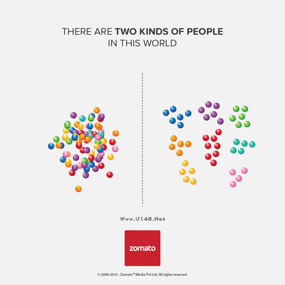 小編平時說世上的人千差萬別,針對不同的事物又有不同的喜好。但是Zomato公司分析了人們在食物、就餐行為上的偏好,卻發(fā)現(xiàn)了一個令人驚訝的事實:世界上只有兩種人!隨后他們把這一結(jié)果用一張張插畫海報對比呈現(xiàn)了出來。小伙伴們快來對號入座吧。