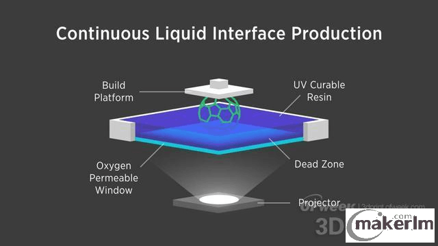 現(xiàn)有的3D打印工藝使用液態(tài)樹(shù)脂,在一個(gè)緩慢的過(guò)程中逐層打制作出物品:先打印一層,固化它,補(bǔ)充樹(shù)脂材料,然后再打印一層,周而復(fù)始,直到打印完成。而在CLIP工藝中,一個(gè)投影機(jī)從下方用紫外線顯示連續(xù)的、極薄的物品橫截面。紫外線在一缸液態(tài)樹(shù)脂中以橫截面方式硬化液體。與此同時(shí),一臺(tái)升降機(jī)不斷將成形的物體撈出樹(shù)脂缸。